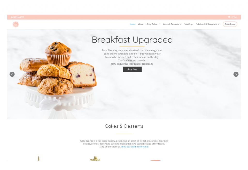Cake Works is a full-scale bakery, producing an array of french macarons, gourmet eclairs, scones, decorated cookies, marshmallows, cupcakes and other treats. The bakery stepped up their social media presence and required quality photography to highlight monthly specials and refresh the website with new additions and updated presentations.