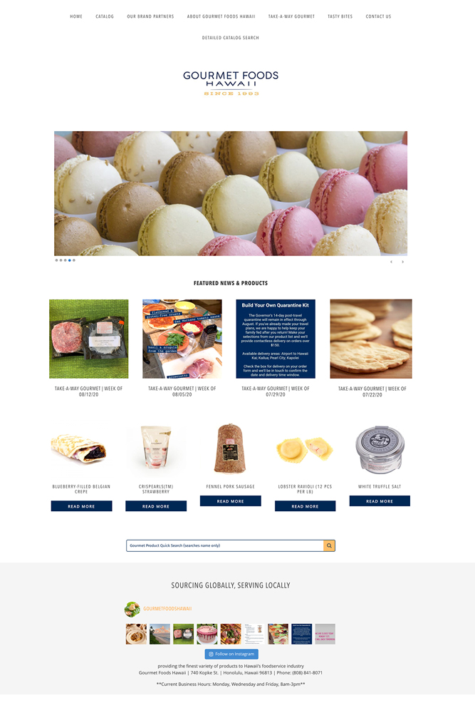 Gourmet Foods Hawaii is a family-owned and -operated food distribution company proudly serving the entire state of Hawai‘i. In 2019, the company engaged PIOMP to help refresh their outdated website with a more modern look (including new logo), updated brand messaging copy and integrate more social engagement features, such as an Instagram feed and newsletter archive.
